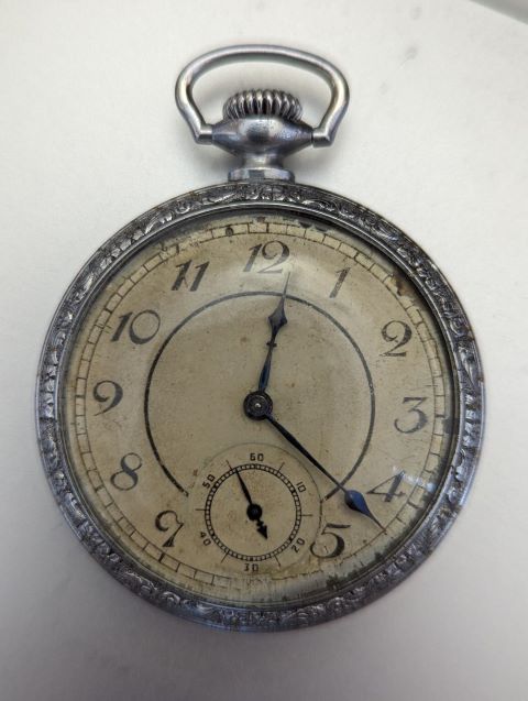 This particular watch appears to be a very early Soviet produced railroad watch using a left over Hampden railroad movement. The painted metal face, case and movement appear to be original to the watch.