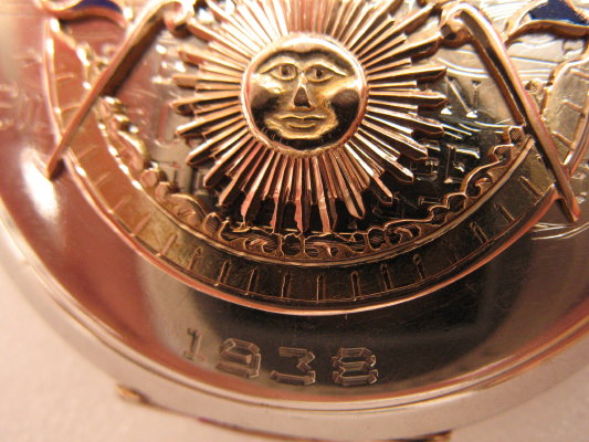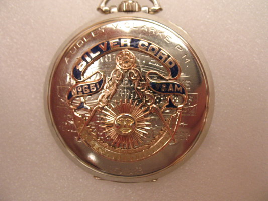 Mike HodgeThanks all of you. I was very pleased when I opened the package and found it to be interesting! Tom, thanks for the research. The fellow I bought it from mentioned Mr. Clarke as being in Toledo, but maybe this was at the end of his time. The seller said his Aunt had cared for Clarke and was given the watch, which was put in a safe until now (40 yrs). The presentation inscription is obscurred by the gold overlay, but it is for Lodge 651, in 1938. As you can see, the gold Masonic emblem was an after thought and was professionally mounted. The dial is made of silver with what appears to be solid white gold numerals. The charm refers to Woodward Council #118 and I don't know (other than 1942-43) anything about that.
