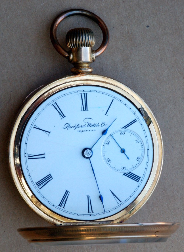 Desmond LundyIn most instances, an open faced watch with a dial lacking sub seconds, involves a hunter movement. Using a conventional dial [sub seconds at 6 o'clock] results in what is euphemistically termed a 'side winder' - a phenomenon all to prolific on ebay. The alternate avenue is to have the sub seconds at 3 o'clock - a practice adopted by by E. Howard & Co when casing stem wind series IV hunter movements in open face cases. A significantly smaller number of Waltham, JP Reed, Rockford and Lancaster watches have been seen with this format. I am attaching a Rockford illustrating that alternate avenue of which I speak. Yours is a legitimate and desirable combination.