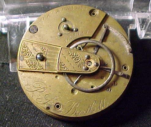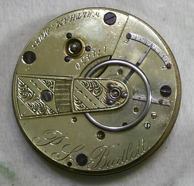 David AbbeCecil, I agree that this has to be a P.S.Bartlett according to the data I showed, there is little doubt of that. The Jeweling reported in the Factory production logs may not be absolutely correct for all movments in that run, but the main top plate is correctly marked for the reported movement and the serial number points to that too. My question about the jeweling was regarding the pivots for the 4th wheel and the escape wheels. The 4th wheel top plate pivot bearing looks in the picture like it could have been re-bushed by a watchmaker repairing it with a brass bushing after the jewel had been damaged. Not important, you have a nice piece, expecially with that case.