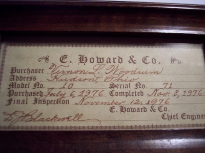 Jerry TreimanThe second label is from a "re-issue" produced by Howard Clock Products, Inc. in the 1970s. The 59-8 was a Vienna-style clock that was produced in a numbered series of 1000 clocks and sold for $800. This late incarnation of E.Howard & Co. also re-issued a banjo and figure-8 clock.