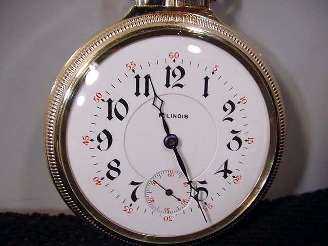 I just browsed through a 1923 Illinois catalog, and though this particular dial is not illustrated there is a Montgomery dial with the same 1-12 numerals and spacing. If the Montgomery 1-60 digits were eliminated it would be very close to the dial we are considering here. There is also no exact match for the hands in this catalog, but there is a very similar set with the only difference being that the diamond shape is filled rather than open.