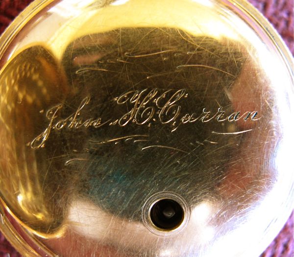 Last week I purchased this 18s Illinois hunter on eBay. I didn't pay much attention to the signature on the dust cover until several days after taking delivery. When I did a Google search on the name, along with "Philadelphia," I discovered that John H. Curran was a professional baseball player who was a catcher with the Philadelphia Athletics in 1876. I also found that the Athletics were in the National League that year, but were then kicked out of the league because of refusing to go on a particular road trip. The date on the movement lead me to believe the watch was made in 1873, but the wording on the dial seems to indicate 1879 or later (see page 81 in the Illinois Blue Book). Is it possible the private label movement was made in 1873, but not assembled until 1879 when the later style wording was being used? I am also interested in finding out how John H. Curran died. He was only 44 and died in Vallejo, CA (Solano County). He is buried in Holy Cross Cemetery, Colma, CA, which is also the final resting place of Joe DiMaggio. Any thoughts on production date of the watch and manner of death of Mr. Curran would be appreciated. P.S. Movement number is 35,294 and case number is 15,857. The only other marking on the case is a crown logo.