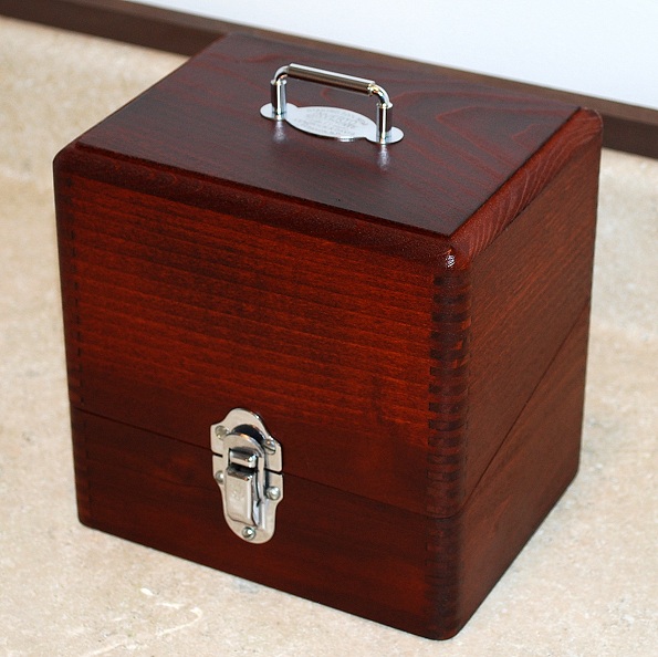 The box was a mess, but all the original hardware was there. I stripped it, broke it apart, floated the panels through the drum sander, re-assembled it, and sprayed it with a medium-cherry dye stain with a Polycrylic binder.