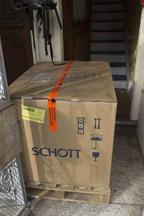 At Last! A brand new supply of 1.5 & 1.35mm Schott B270i crown glass. Ordered before Christmas. Shipped via sea freight from Hamburg to NY, then by truck from NY to Oakland. It barely fit through the front gate. Each 22 x 35" sheet had to be carried up stairs one at a time.