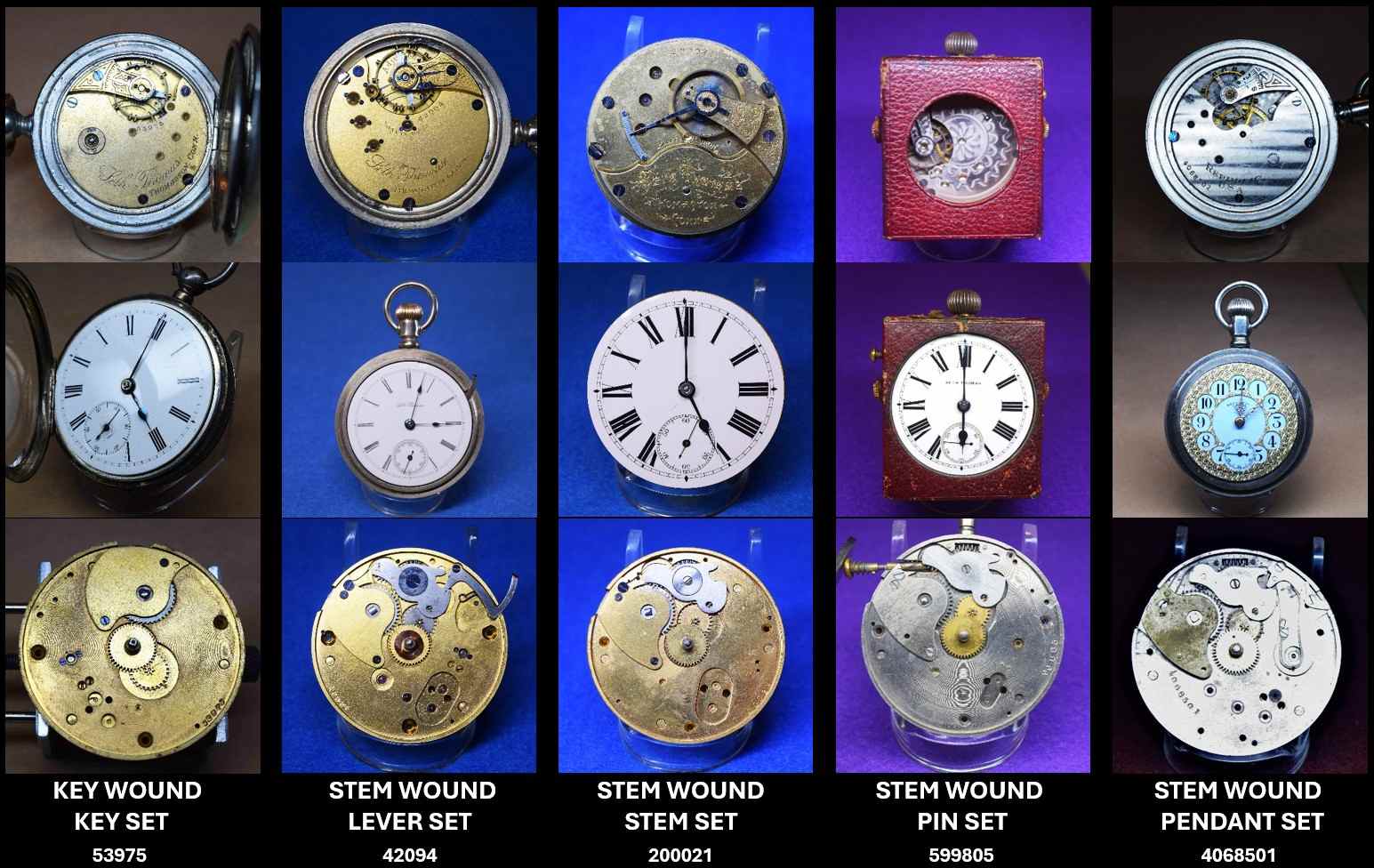 Most of these systems can be easily identified visually. The illustration below introduces representative examples of each system. The Higginbotham Stem-wound & Stem-set movement is the only one with no visible winding and setting components easily discerned as many of those components are between the top plate and the pillar plate.