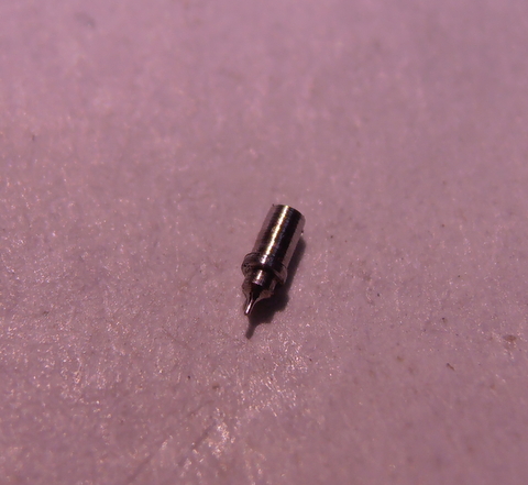 Sometimes a part just isn't available and the only choice left is to make it. This rare Rockford wind indicator had a broken pallet pivot. Unable to locate the part, it had to be made. Fortunately the arbor is pressed into the pallet and not screwed in like many are. Sometimes you can re-pivot. The first picture shows a hole drilled into the end of the existing arbor.