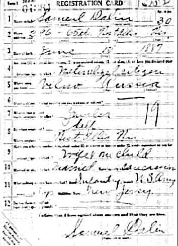 Dalin Samuel enlisted 01/05/1909 some where in NY, born Vilna Russia age 21 6 months occupation jeweler brown eyes black hair dark complexion 5'7" 3/4 Regiment 13 Inf 16 ? Discharged Jan 4 1912 at Fort Lascuim(?)Alaska.