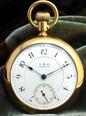 The dial below is a correct Waltham American Watch Grade Model 1872 dial, but very unusual in that it is double-sunk. It is on OF AWCo Model 1872 #2,605,082, which has a nonmagnetic balance and escapement, also unusual.  It is in a 14k Waltham-signed case.  AWCo Model 1872s are not abundant.  Less than 2,000 were made. .jpg) | |||