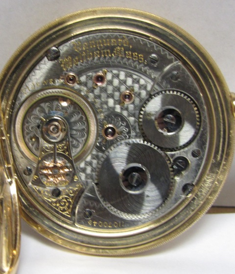 I have a Waltham Vanguard 21 Jewel serial #1107049. the case # is 59070 B.W.C.Co warranted 18k. It has what loks like fancy E in the inside of the dust cover. Chris Abell did a fantastic job cleaning it up. I did a lesser job on the photos. Is this case solid gold? The insription reads: To M. Gray from Father August 8th, 1879. I wrote a previous post on this watch but I now know thanks to Chris that the movement was not original to the case. It is I believe some 20 years newer. Please view my attemy at photos below. Is this watch solid gold? I am thinking about selling it here at IHC185. What would the approximate value be?