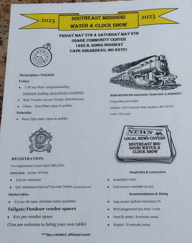 Hello everyone, I myself am putting on a watch and clock cshow like the regionals down here at the Osage enter in Cape Girardeau Missouri May 5th and 6th 2023 Admission is 10.00 per person and 8' tables to sell is 15.00 each, I am doing this to try and get more people involved in the history of horology, I have flyers and everything posted on my ******** groups also on, since I cant post the flyer here because of the size you wouldn't be able to read it, if youd like a registration send me an email and I Can either email you one or mail one, I really hope this will be a great show for everyone, and really affordable also..