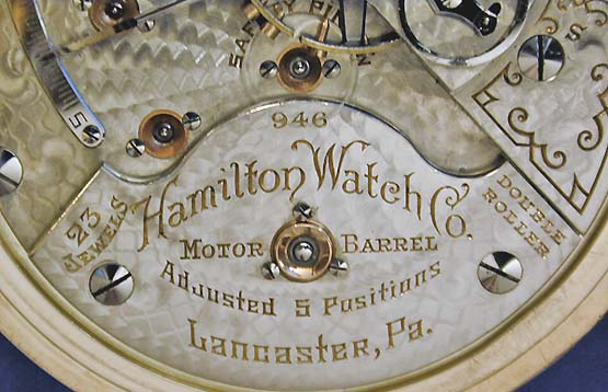 David AbbeI tried to clarify the image to improve the many markings Hamilton so proudly made on the Barrel cover. About this time the "new" RR Time act rules added that all features were clearly engraved on the movement, including model number, # of Jewels and # of Adjustments. Hamilton chose to add their own other features such as Motor Barrel (very complicated on this model) and the Double Roller (good idea).