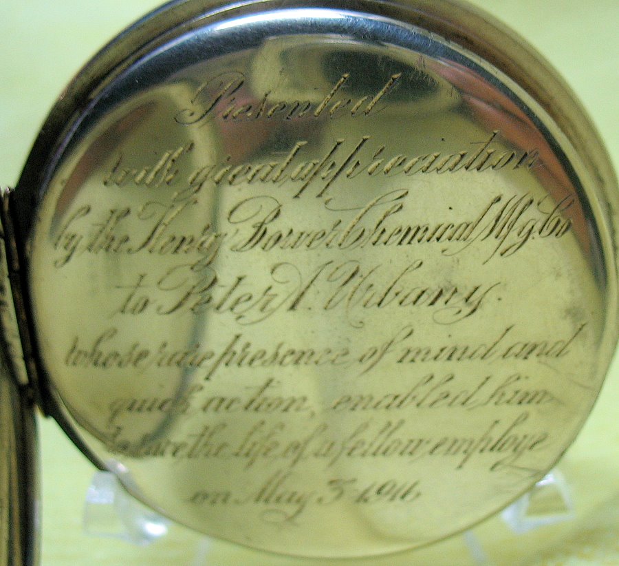 David AbbeI remain very curious about the 1916 Bower Mfg Co. Chemical accident that Mr Peter Urbany got this very nice Waltham Watch Award for his lifesaving heroism on May 3rd, 1916.