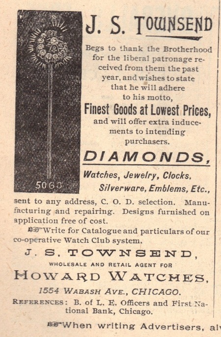 A full-page back cover Brotherhood of Locomotive Firemen Magazine November 1893 advertisement from JS Townsend, offering Gold Watch's from $9.00 Upwards, with diamonds from $18.00. The Leading Railroad Jeweler Established 1877. Offering A Match Safe Showing World's Fair Buildings, Raised Work, will be given to any one ordering goods to the amount of $5.00, with illustrations of gold emblems for Ladies Auxiliary to the B of LE, and Grand Lodge L.A. To BRT, and Crown gold pocket watch cases. Also offering Grand Officers Jewels, and Regalias.