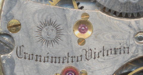 There were also many made for the South American trade which were exported by R.R.Fogel and carry his trademark names, such as "Cronometro Victoria" or "Cronometro Supremo". These show up in the serial number list by their trademark name, but also are in groups of "Export" movements. Unlike the bulk of the european export models, Fogel's exports were higher-grade nickel movements. This is one of his lower-grade 15j Cronometro Victoria movements. The Cronometro Supremo was a 21 jewel movement. Both of these "grades" were made in several sizes and models. They were exported in cases made for Fogel, with quality names such as Victoria and Estrella.