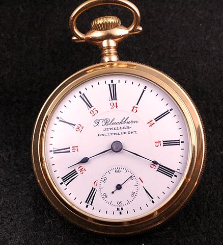 Ed UeberallI don't think there is any doubt that having a matching private label marking on both the dial and movement will increase its value, as will the 24 hour "Canadian" style dial. The case shows an extra set of screw marks, which would detract a bit. These 17 jewel adjusted watches with private labels seem to be going in the $400 to $700 range. Yours appears to be in very nice condition so I would guess that it would go in the upper portion of that range.