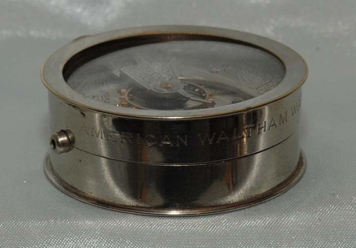 Does anyone know what this Waltham was used for. Car clock? Ships clock? Salesman sample? Store display piece? I have not seen anything like it. According to my Waltham book, serial number 15148291 should be a 18s model 1877 with 7-11 jewels. This does not look like a '77 & it has 17 jewels. It is housed in a Waltham Watch Co. case with a display back. The crown is larger than normal also. The case has two extensions, one at the 12:00 & 6:00 which looks like it might have been in some type of standard so it could swivel. Any ideas? Thanks, Jim