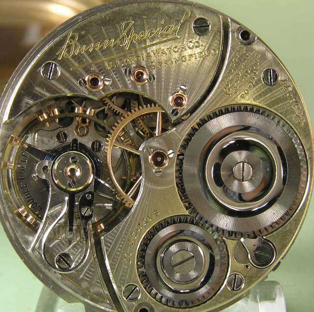 Steve MiddlesworthJust so you don't think that color on the movement is being reflected by the case, here is the movement out of the case. You can see the finish is worn off the balance cock and on the barrel bridge just above the 21 Jewels as well as on the train bridge just below and to the left of the Bunn Special.