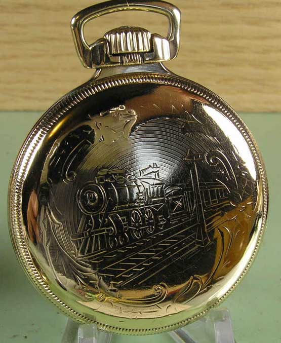 Steve MiddlesworthHere is the back of the Rail Road Keystone case. Nice train engraved on it but the back does have a little brassing.