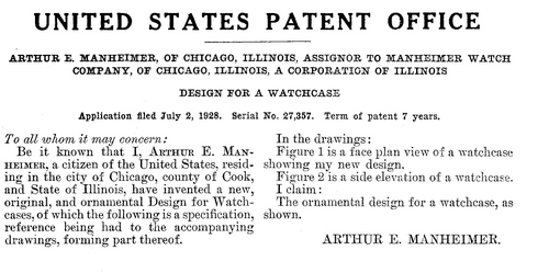 Tom BrownHere is the patent for the case it is from a Arthur E. Manheimer of Chicago of the Manheimer Watch Company of Chicago.