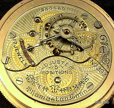 One of the odd things about Model 5 Seths is the absence of the 35-minute-position socket for the third dial foot. The crappier Models 6, 8, 10, and 12 all have sockets for three dial feet, but the 21-jewel grades and up (including the Maiden Lanes) only have two.
