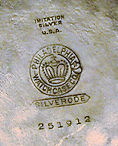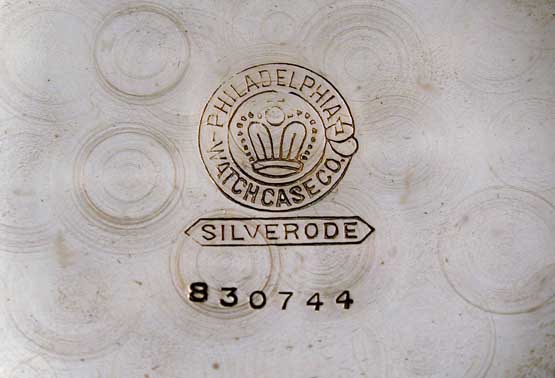 The engraving inside the case back consists of the text " Philadelphia Watch Case Co " inside a double circular ring which encloses a "Crown".