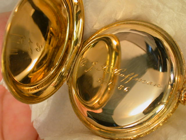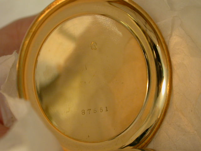 I have this old case that appears to be gold. Here are the only markings;[see picture]. I could really use some help in ID ing the case contents and case maker. It is a 16sz H/C and holds an Elgin doctors watch. The "flex" test on the cuvette is not of much help, as the case is very heavy, but it does flex just a bit that I can pick up. For the record here are the weights with it all together and with the movement and crystal totaled and in three different units of weight; 126.4g~81.3dwt~4.060ozt. Thanks for what you can give to me on documentation. Regards,bb