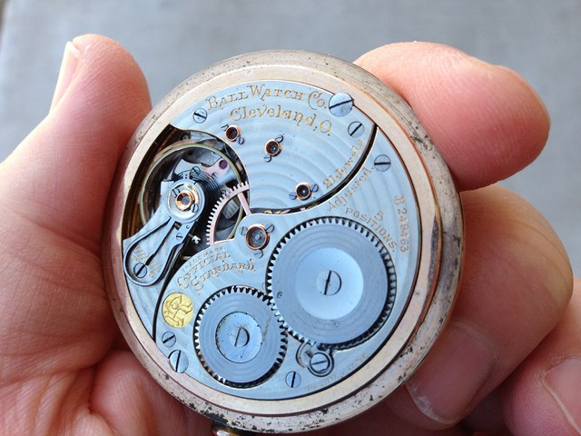 Mine is this Ball-Waltham Official RR Standard, 21j from circa 1911, with single sunk dial with a very feint hairline. States, "Adjusted to 5 positions". Incorrect case but possibly the correct hands.