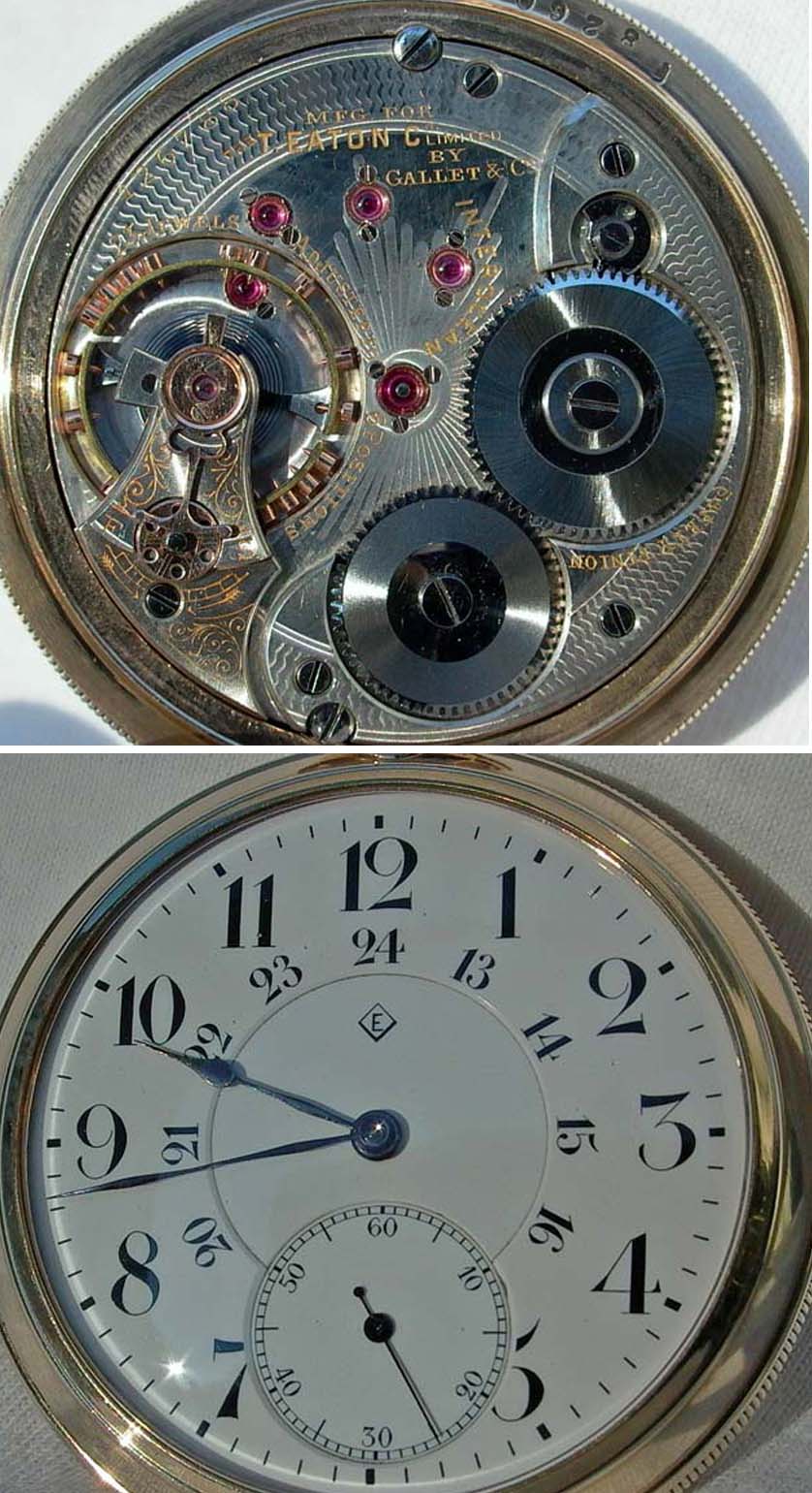 Edward L. Parsons, Jr.Here's an interesting high-grade Swiss watch made to resemble a Waltham Model 1892 by Gallet & Co. for sale in Timothy Eaton's Canadian department stores. I collect Model 1892's, so this 18-size, 23-jewel 6-position Interocean model really does speak to me, espectially the bold RN 24-hour PL dial, which has to be the coolest Canadian style dial I've ever seen.