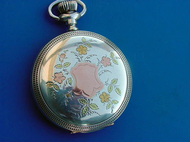 Here is a nice waltham 16 size sterling case with a little splash of color...I was taking some pictures for a ebay auction i thought i would post some pictures before it,s gone.