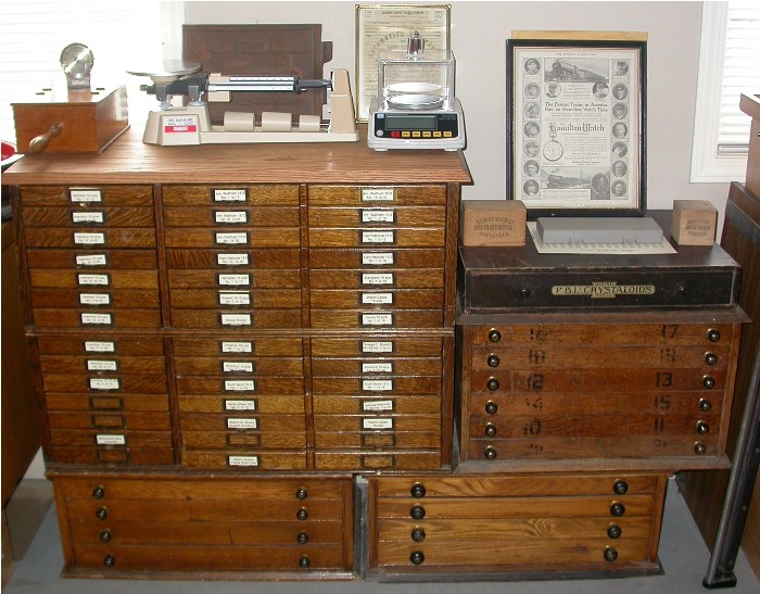 Those are some beautiful cabinets! I hope someday to have some nice cabinets like that. My father has a Hamilton map cabinet with like 30 drawers (its around 48" wide by 54" tall or so) and it works very well for movements. If you ever get to the point of wanting to sell those parts out, just let me know. you're only 900 milles away from me in north dakota and it looks like you have enough stuff there to last a lifetime for me