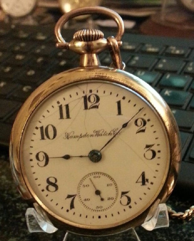 Thanks in advance. (The front is a simple Arabic single sunk dial with correct Hampden thin spade hands, script hampden watch co.)