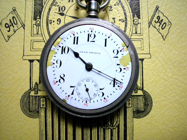 Here's the dial on the Seth Thomas and it has suffered some abuse. I had it serviced in the mid-1960's after begging it from my grandparents and the watchmaker patched the dial. The once white patches have yellowed over time. This movement is pendant set.