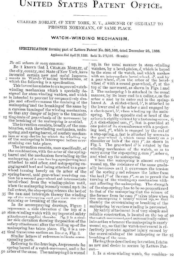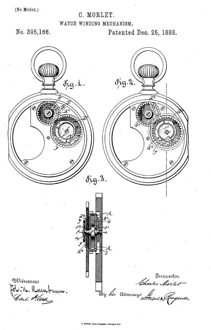 There is a second patent; not granted to Duane Church, but to Charles Morlet. Morlet was playing his cards very close to his vest and describes the device only as a “Watch Winding Mechanism”. The number is 395,166. The patent for it was granted on December 25th 1888, but the application was filed on April 28th 1888. Although the April date is rather late in the development phase, the winding mechanism design may not have been submitted for patent until after its worth had been proven.