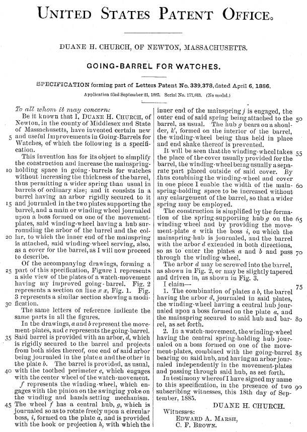 I rather suspect that this is not the Duane Church patent for which you are seeking, but I do have a record of patent 339,378 which was granted on April 6th 1886. Church, however, refers to this as a going barrel.