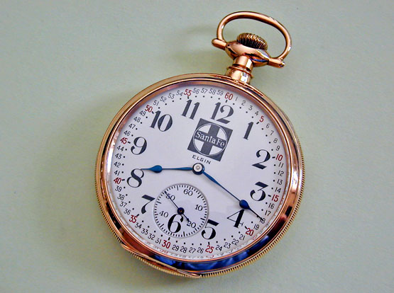 We very infrequently find the logo of the Atchison, Topeka and Santa-Fe Railroad on these specially made Elgin dials. Railroad names and logos are sometimes added to counterfeit dials but dials like this one are the real deal. Notice the logo is fired into the porcelain along with the other markings and the Elgin signature appears below the Santa-Fe trade-mark. As I mentioned above "Santa-Fe" is combined with Montgomery Patented Markings, the patent on which was held by Henry S. Montgomery who was the Santa-Fe Railroad Time Inspector. I guess that's about as "Santa-Fe" as it gets.