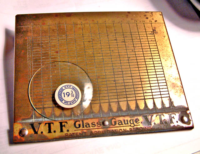Here is a neat item I recently acquired along with a glass crystal cabinet. I had heard these existed but never saw one until now. It is an antique sight gauge for sizing round glass crystals. The gauge grid is engraved with 16 vertical lines interesected by 25 sloping lines.