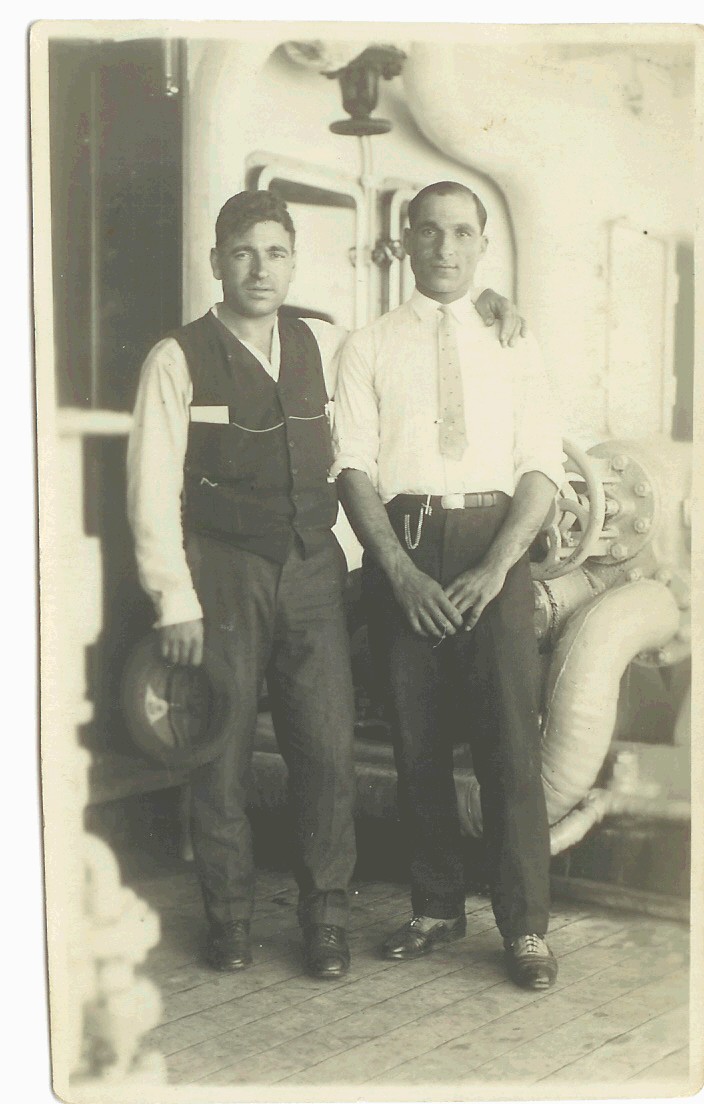 At the risk of turning this into a Belmonte genealogical site, here's a better view of how my grandfather wore one of his chains (the same one in the previous photo). That's him on the left, with a friend, aboard the steamship Duilio, in August, 1924, on his way back to Italy to visit his mother, Caterina Belmonte, and, incidentally, to marry his second wife, my grandmother, Raffaela Dodaro. His friend is wearing an interesting chain in an interesting manner -- it appears that he has placed it through a belt loop or perhaps over his belt.