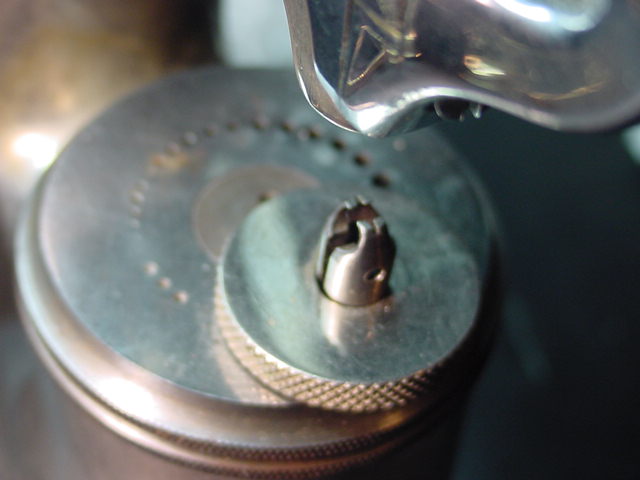 Samie L. SmithThen with a few light taps on the stake with a small hard rubber or rawhide hammer the balance will drop down and leave the roller tables setting on top of the remover..When you do this have your anvil setting back on the bench away from the edge beasuse these will fall off sometimes.What i do is leave the stake setting against the roller tables till i get ahold of them with a pair of tweezers..