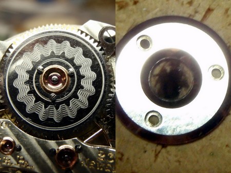I am not trying to be stubborn and if my watch is wrong it is what it is, I just think it unusual that if these were all fixed with replacement parts they are fixed exactly the same. If you notice the three screws that hold the jewel on my watch are also different from the screws that hold the cover in place on yours. So if these were repaired watches the jewel & setting, the ratchet wheel & the 3 screws would have to be replaced in every repair & that makes me ask why replace so many parts & also what was being fixed? Was the jewel broken & they couldn't find new ones, sis the ratchet wheel break?