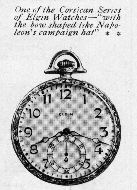 http://elginwatches.org/scans/sales_catalogs/1925_Elgin_elegance_and_efficiency/m_page_02_03.htmlThe Corsican series had a fine 21-jewel Lord Elgin movement and a distinctive case. The Corsican name comes from an earlier version, as seen (and explained) in this 1921 advertisement. Napoleon was from Corsica.