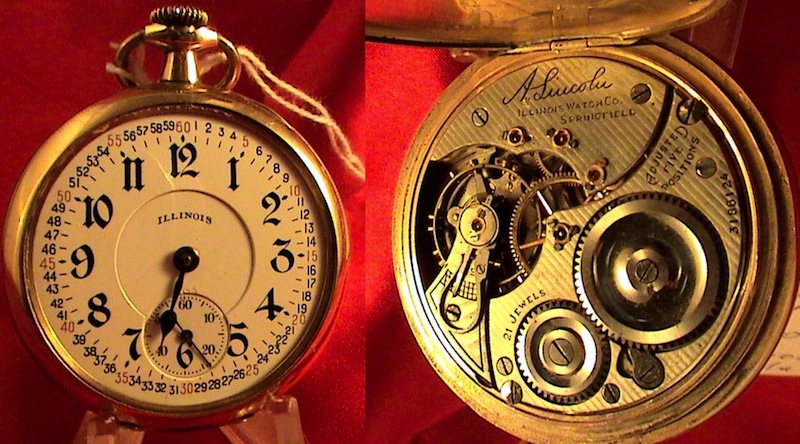 About 4 years ago, I restored a s/n 3186124 Model 9, 16s 21J Illinois A. Lincoln and was delighted to find that it was a "1 of 1,000" in quality and accuracy! A good friend bought it and has carried it ever since . . . until he left it in his fob pocket that went through the wash! Total damage: Broken crystal, missing minute hand! STILL RUNNING!!! He "dried it" with a hair dryer on "cold" and you can see that there is absolutely no harm done excepting the afore-mentioned parts. When the replacement minute hand arrives, I will take it to a friend who lets me use a bench to disassemble, clean and inspect it further then replace that missing jewel screw, the hand and crystal and re-lube it.