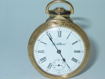 The hands look okay, the movement looks okay. The dial would usually be Arabic and not Roman numbered but it could be original. The dial looks like a good double-sunk porcelain dial and would be appropriate for any number of higher-grade South Bend movements made in the 1908 - 1914 time frame. I am by no means an expert at these things so please take what I say as just my personal assessment. The last time I saw this particular watch was on Ebay. It went for $712 on Jan. 12th of '05.