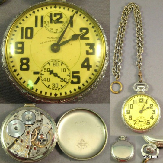 Richard M. JonesMy first thought was that I had made a good buy on a really nice Waltham movement and would recase it in an appropriate Waltham case. However David made me rethink the matter because I can certainly see a man wanting a white gold filled stirrup bow case which to my knowledge would have been a Ball case and if a buyer purchased the Waltham from a jeweler who handled Ball watches it seems quite reasonable. Further the condition of the case is cosistent with the condition of the Waltham movement. I have had the 23j Vanguards before but this movement shows as though it was new. Ah if only it were solid white gold!