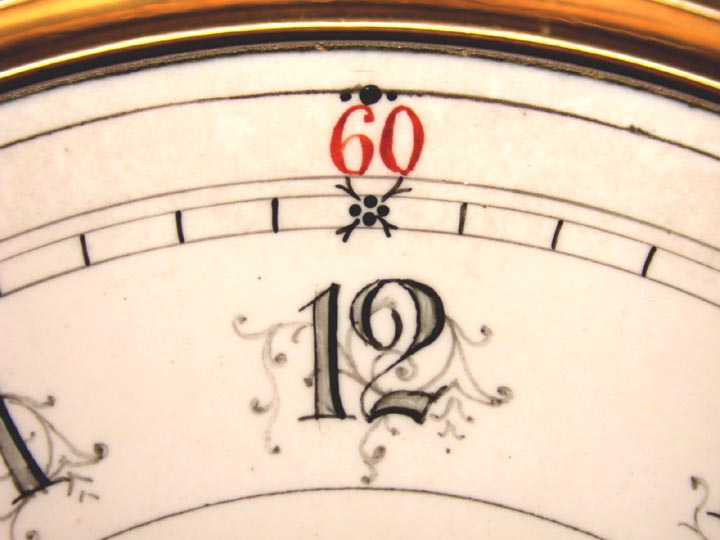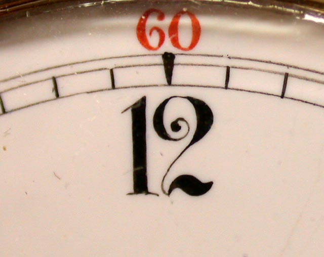 Since totally unembellished dials are sometimes Moorhouse dials, this dial could be, too. However, the more relevant question is: Is there reason to think it is? The answer is: not especially. True, many signed Moorhouse dials feature embellished numerals similar, though not exactly identical to those on this dial, but so do many painted by other workmen. Unless such embellishments appear together with one of Moorhouse's more distinctive artistic signatures, such as his unique line decorations at the quarters of the minute track, or skeletonized, filled numerals, or grey and red lacework enhancements, or his characteristic finials or cartouches, "fancy" numerals in and of themselves don't really tell one that much.