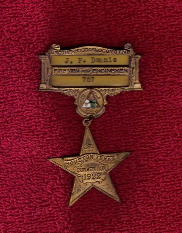 Larry BuchanHere is a delegate's metals from the 1922 Houston convention for J.P. Dennis Lodge 757(Paso) El Paso, Texas that represents locomotive firemen working on the New Mexico El Paso and South Western Railway