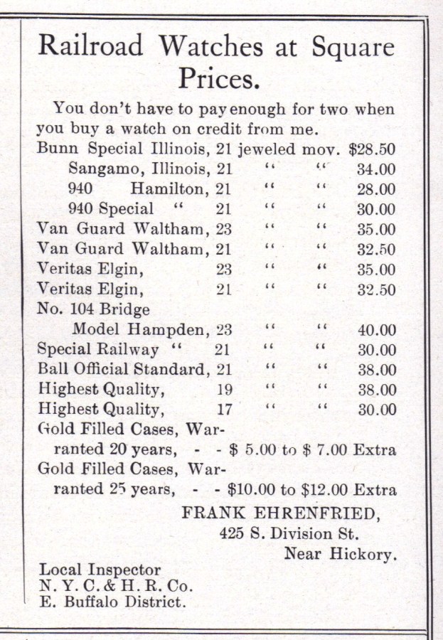 Larry BuchanAnother interesting Local Inspector of the New York Central, East Buffalo District, showing the prices of his railroad pocket watches, of special interest is the highest priced Hampden 16 size, 23 jewel Bridge Model No. 104 at $40.00.