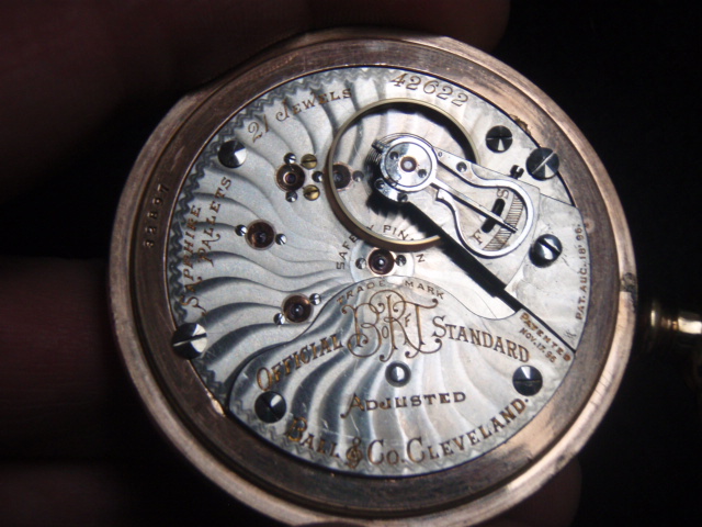 About the hands on your watch, as Debbie explained to you in her February 27th posting there are representative examples of correct 18-size watches shown in our Ball Watch Company Research Forum and to get a flavor of just how distinctive the correct, original hands are begin with Ball-Howard, 1890s Beauty then go to Early Ball-Hamilton 18-size Images where you will see the only two styles of hands that could have originally been fitted to your watch. The "Pierced Hands" shown on various of the watches shown there including those on contemporary advertising in that topic and the spade hands that are shown on 20577 in that same grouping, which are identical except they are not pierced. A later, slightly heavier style is shown on 170249 and then in Later Ball-Hamilton 18-size Images a much later style appears on some of the last 18-size Ball movements ever made. Close examination of all that information and images shows how precisely matched three hands on Ball Watches will be. Unfortunately your number 42622 has later replacement minute and hour hands but that is not unusual as hands were often replaced. Your seconds hand is similar to one a non-pierced set of the correct era but the center looks to be a bit larger diameter than usual.