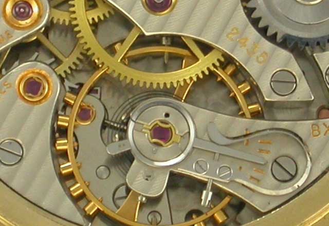 Larry BuchanHere is a photo of a Ball Record 435C movement. Notice the pallet, and escape wheel have conventional jeweling. [