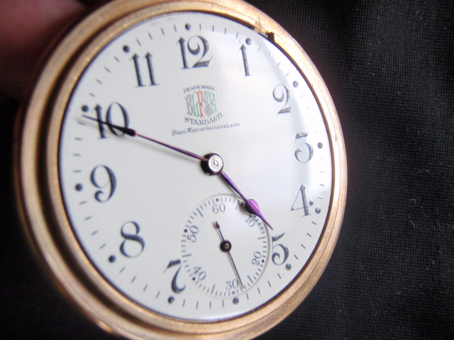 Hi All, I was compelled to aquire this fantastic example of a 16size Ball-Waltham BLF&E. The Ball Model Case is very nice, no inscriptions, no brassing, bow is stiff, the watch is all original and the movement appears to have never been removed from the case and has a wonderful pattern back. There are no jewelers inscriptions inside the back cover and has the proper gold BLF&E seal. The movement is absent of any jewelers slips or tarnish and runs fantastic, the balance is true in the flat and round. The BLF&E dial is free of cracks and aside from the tiny flea bit around the center hole it is in fastic condition. The hands are mint, a wonderful plumb color which tops off the dial nicely. I added a few pic's of the BLE I aquired a few months back for your viewing pleasure. regards All Joe